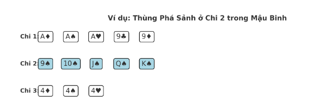 - Chi 2: 9♠ – 10♠ – J♠ – Q♠ – K♠ (Thùng phá sảnh)