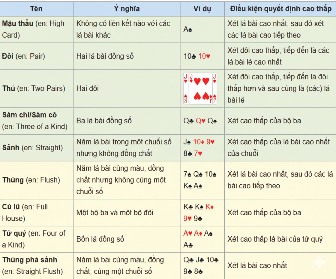 • Sảnh rồng: 13 lá từ 2 -> A không đồng chất.